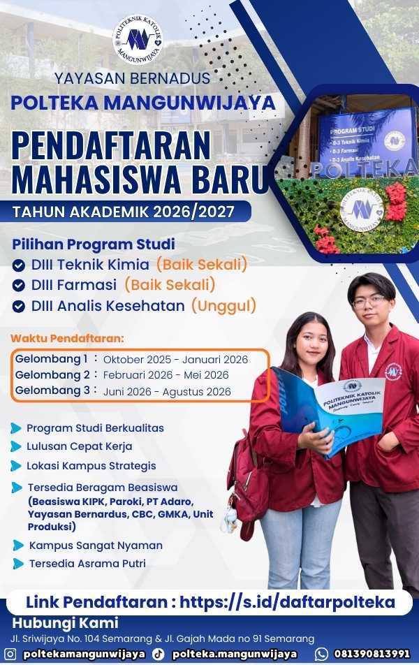Politeknik Katolik Mangunwijaya adalah perguruan tinggi di bawah Yayasan Bernardus, yang terdiri dari tiga program studi, yaitu D3 Teknik Kimia, D3 Farmasi dan D3 Analis Kesehatan. Politeknik Katolik Mangunwijaya merupakan hasil penggabungan dari 3 akademi, yaitu Akademi Kimia Industri Santo …