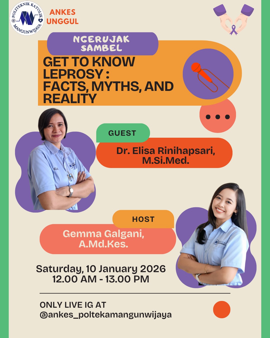 Lepra atau kusta masih menjadi salah satu penyakit yang sering disalahpahami di masyarakat. Banyak mitos berkembang dan memicu stigma negatif, sehingga pengidapnya kerap mengalami diskriminasi. Melalui sesi ini, Polteka Mangunwijaya berkomitmen memberikan edukasi sehat untuk meluruskan pemahaman terkait penyakit tersebut berdasarkan ilmu medis dan realita lapangan.