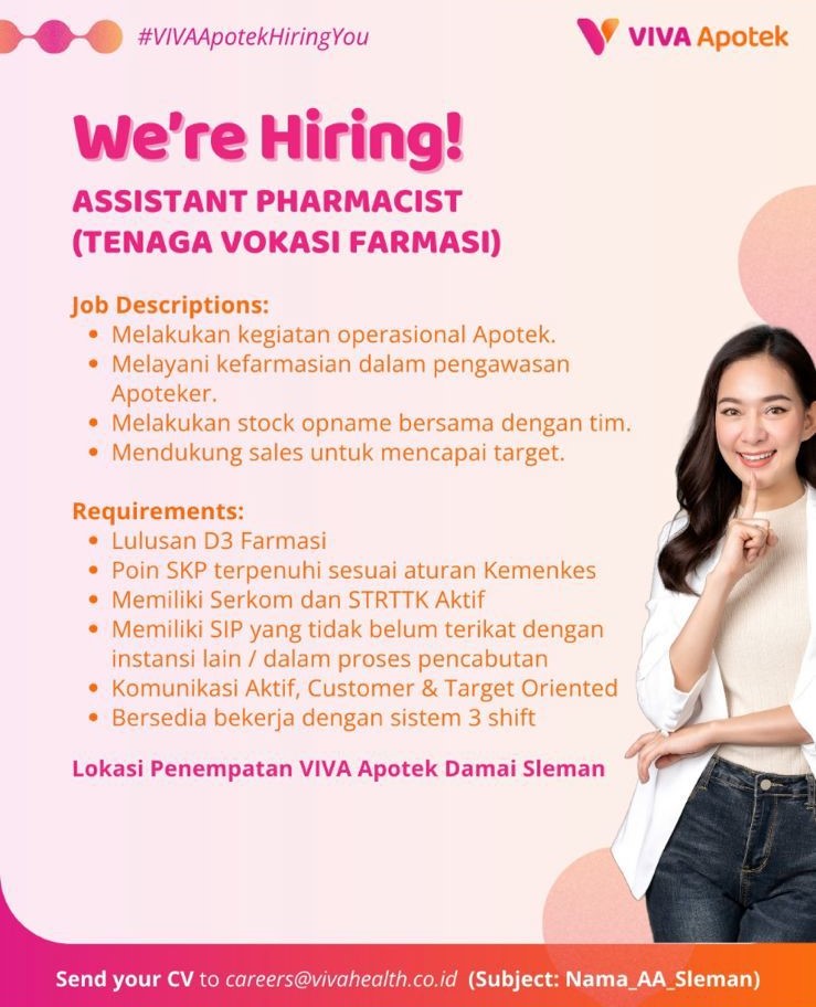 VIVA Apotek Damai Sleman membuka lowongan pekerjaan sebagai ASSISTANT PHARMACIST